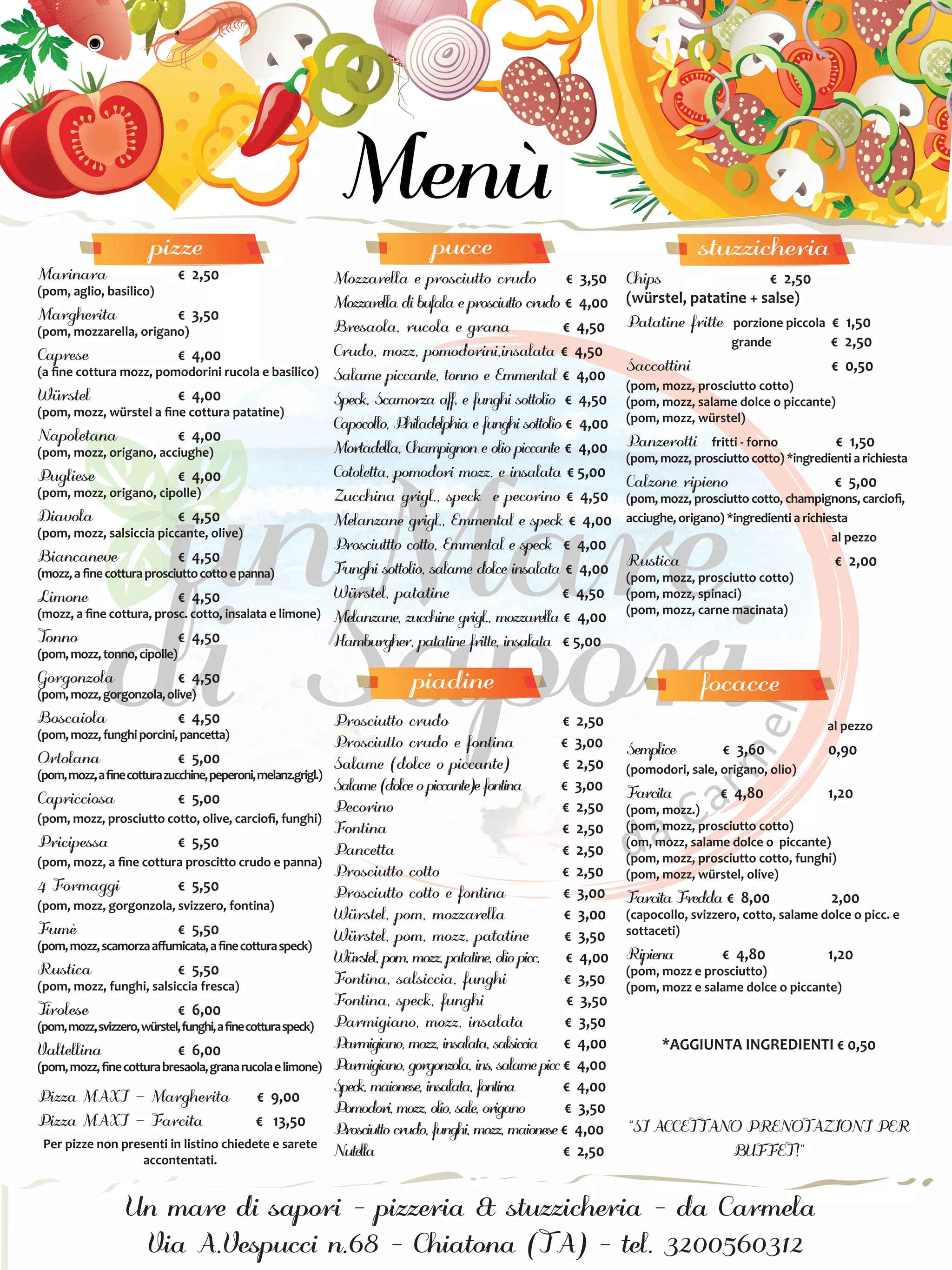 Il documento presenta il menù di una pizzeria e stuzzicheria, con una vasta gamma di pizze, pucce e stuzzichini a prezzi variabili. Le opzioni includono ingredienti come mozzarella, prosciutto crudo, tonno e diverse varietà di salumi e formaggi. È possibile prenotare pizze personalizzate non incluse nel menù.