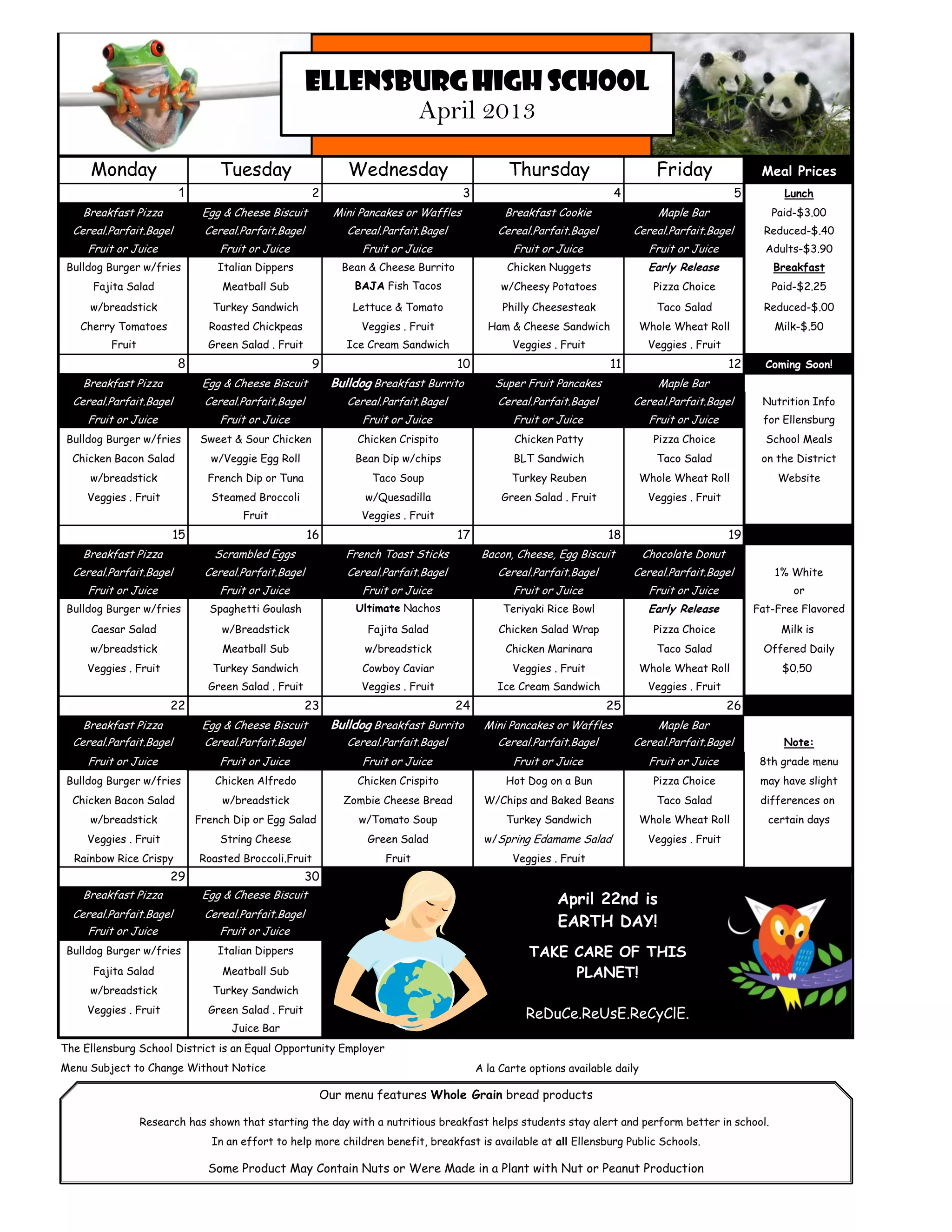 The document provides the April 2013 breakfast and lunch menu for Ellensburg High School. It lists the daily breakfast and lunch meal options, which include items like pizza, sandwiches, tacos and salads. It also lists the prices for student meals as well as milk. At the bottom it provides some additional notes about whole grains, breakfast benefits, and potential nut ingredients.