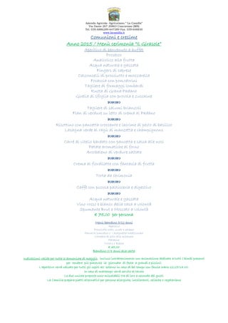 L'agriturismo 'La Camilla' offre un menù per cerimonie con un aperitivo di benvenuto, piatti tradizionali e dessert, al costo di €75 per persona, con un menù ridotto a €35 per bambini. Durante le domeniche di maggio, è previsto intrattenimento per bambini e l'aperitivo si svolgerà all'esterno, compatibilmente con il meteo. L'azienda è anche attenta alle esigenze alimentari, preparando opzioni per allergie e intolleranze.