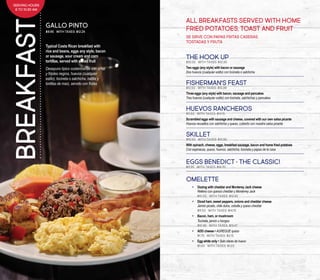 The document provides a comprehensive menu with prices and descriptions for various meals including breakfasts, sandwiches, salads, pizzas, tacos, and main dishes. Each item is detailed in both English and Spanish, and prices include taxes, along with serving hours specified for breakfast and lunch/dinner. Additionally, options for a la carte orders, split plates, and extras are highlighted throughout the menu.