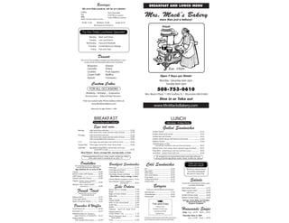 The document is a menu from Mrs. Mack's Bakery. It offers a variety of beverages, daily lunch specials ranging from meatloaf to fish and chips. The bakery case features homemade brownies, donuts, cannolis and other treats. Breakfast is served all day until 1:45pm with options like eggs, omelettes, and breakfast sandwiches. Lunch includes grilled sandwiches like grilled cheese, Reubens, and tuna melts served Monday through Friday.