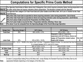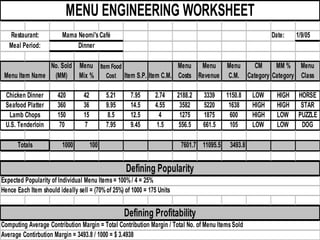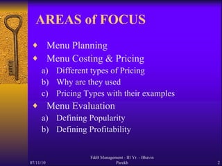 The document discusses various aspects of menu planning, pricing, and engineering for food and beverage operations. It covers areas like menu planning, different types of pricing methods, evaluating popularity and profitability of menu items, improving and analyzing menus using computer systems, and how the menu forms the foundation for control processes in F&B operations. It also discusses how menus influence other aspects like product control, cost control, production requirements, staffing needs, and revenue control procedures.