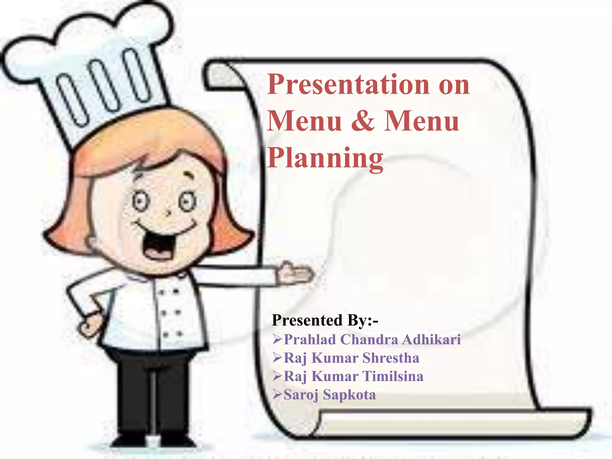 This presentation discusses menu planning and different types of menus. It defines a menu as a list of dishes available at a food service establishment. There are five main types of menus: a la carte, which allows customers to choose individual dishes; table d'hôte, which offers a limited fixed-price multi-course meal; buffet menus for large events; and cyclic and static menus that change periodically or remain the same, respectively. The presentation also covers the functions of menus in providing information, facilitating ordering, offering choices, crafting an establishment's image, and increasing sales. It emphasizes that effective menu planning considers the kitchen's capabilities, facility limitations, menu items, and costs.