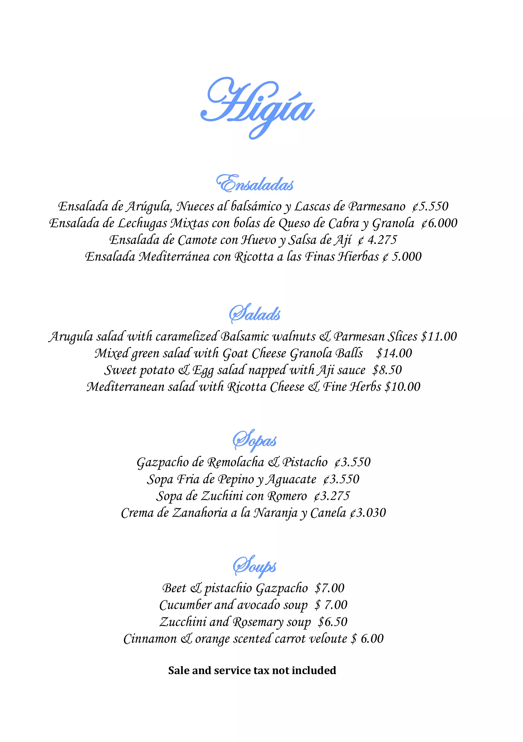 The document lists various salads, soups, vegetarian dishes, non-vegetarian dishes and desserts available at Higía restaurant along with their prices in Costa Rican Colones and US Dollars. Salads include arugula salad, mixed green salad and Mediterranean salad. Soups include beet and pistachio gazpacho, cucumber and avocado soup. Vegetarian dishes include eggplant stuffed with mozzarella and pesto and chickpea cakes with tapenade and green salsa. Non-vegetarian options consist of dishes like almond chicken, ginger salmon and lemon chicken. Dessert selections comprise Bombay oranges, apple crumble and sesame seed samosas.