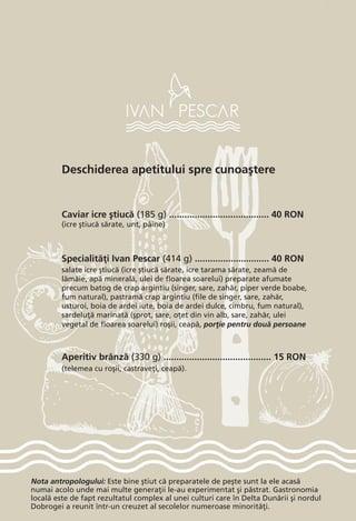Restaurantul Ivan Pescar promovează gastronomia locală prin preparate din pește proaspăt, local și de sezon, respectând capturile responsabile. Cu un meniu diversificat ce include specialități precum icre, preparate afumate și diverse feluri de mâncare din pește, se pune accent pe susținerea consumului responsabil și pe tradițiile culinare din zona Deltei Dunării. De asemenea, se avertizează asupra alergenilor și se recomandă consumatorilor să aleagă cu grijă preparatele din meniu.
