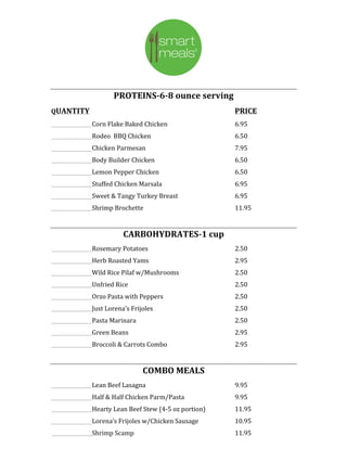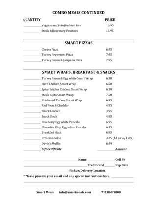 This document contains a menu and price list for Smart Meals, a prepared meal delivery service. It lists various protein, carbohydrate, combo meal, pizza, wrap, breakfast, and snack options along with their prices. At the bottom is an order form requesting customer contact information and payment details. The menu offers a wide selection of prepared low-calorie, high-protein meals and snacks for delivery or pickup.