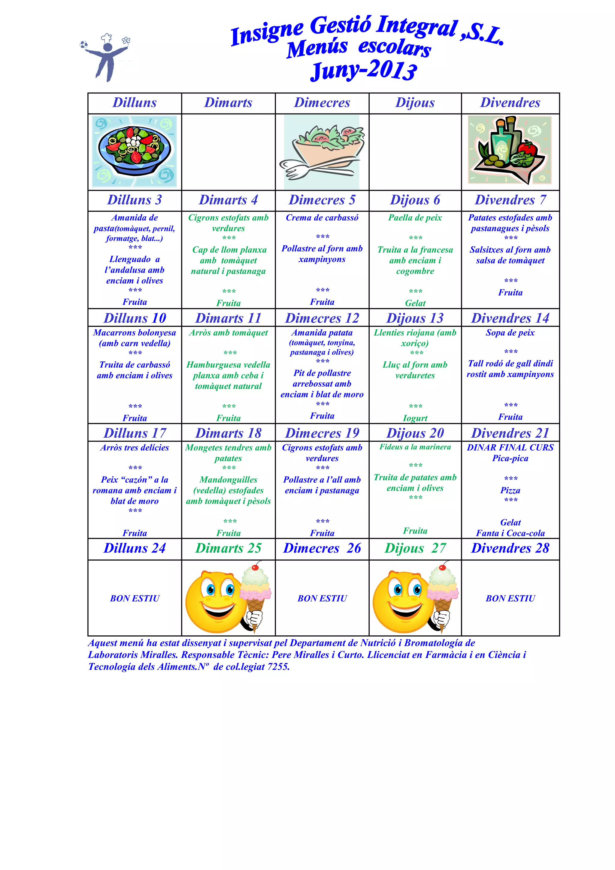 Aquest menú ha estat dissenyat i supervisat pel Departament de Nutrició i Bromatología de