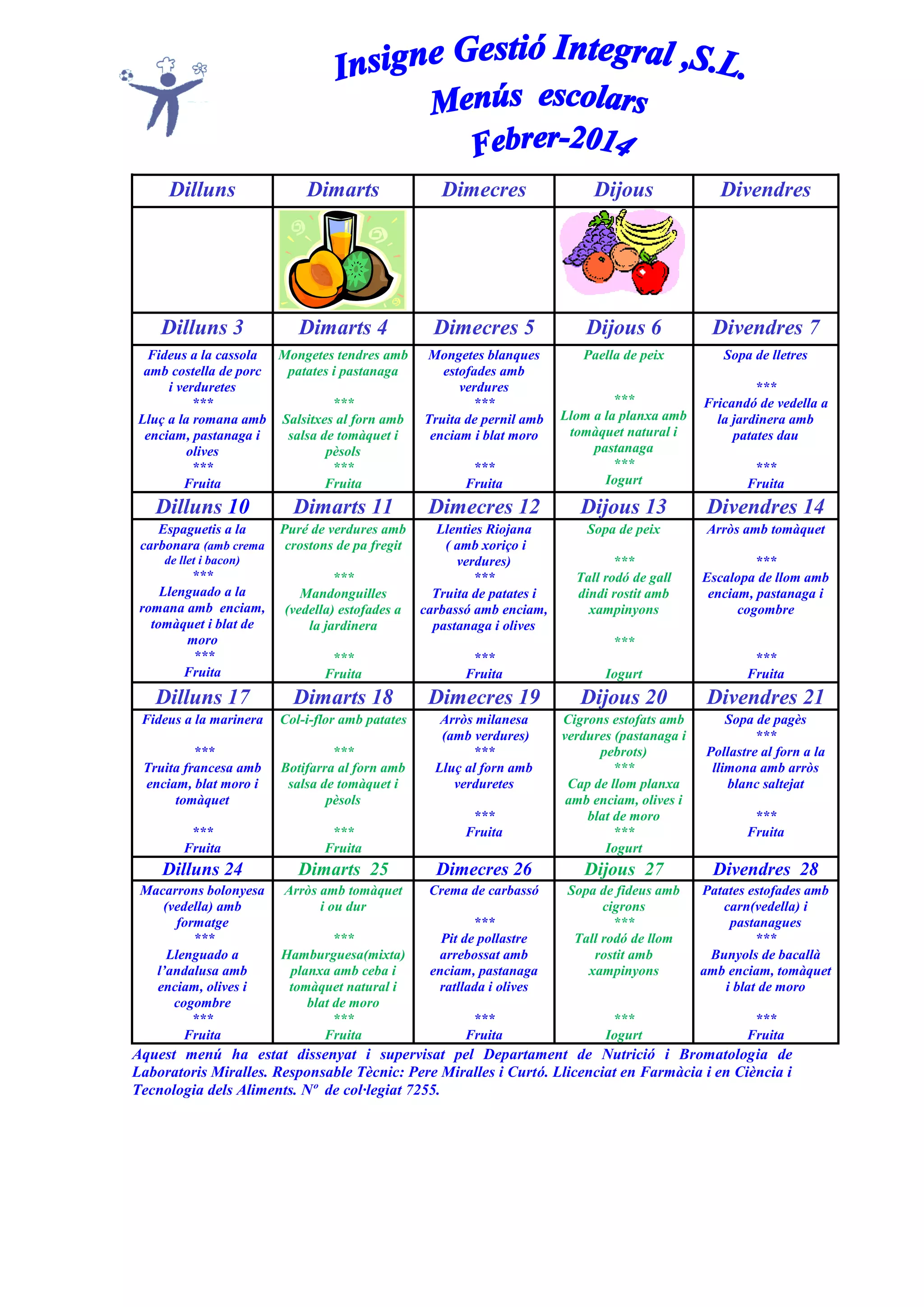 Aquest menú ha estat dissenyat i supervisat pel Departament de Nutrició i Bromatologia de