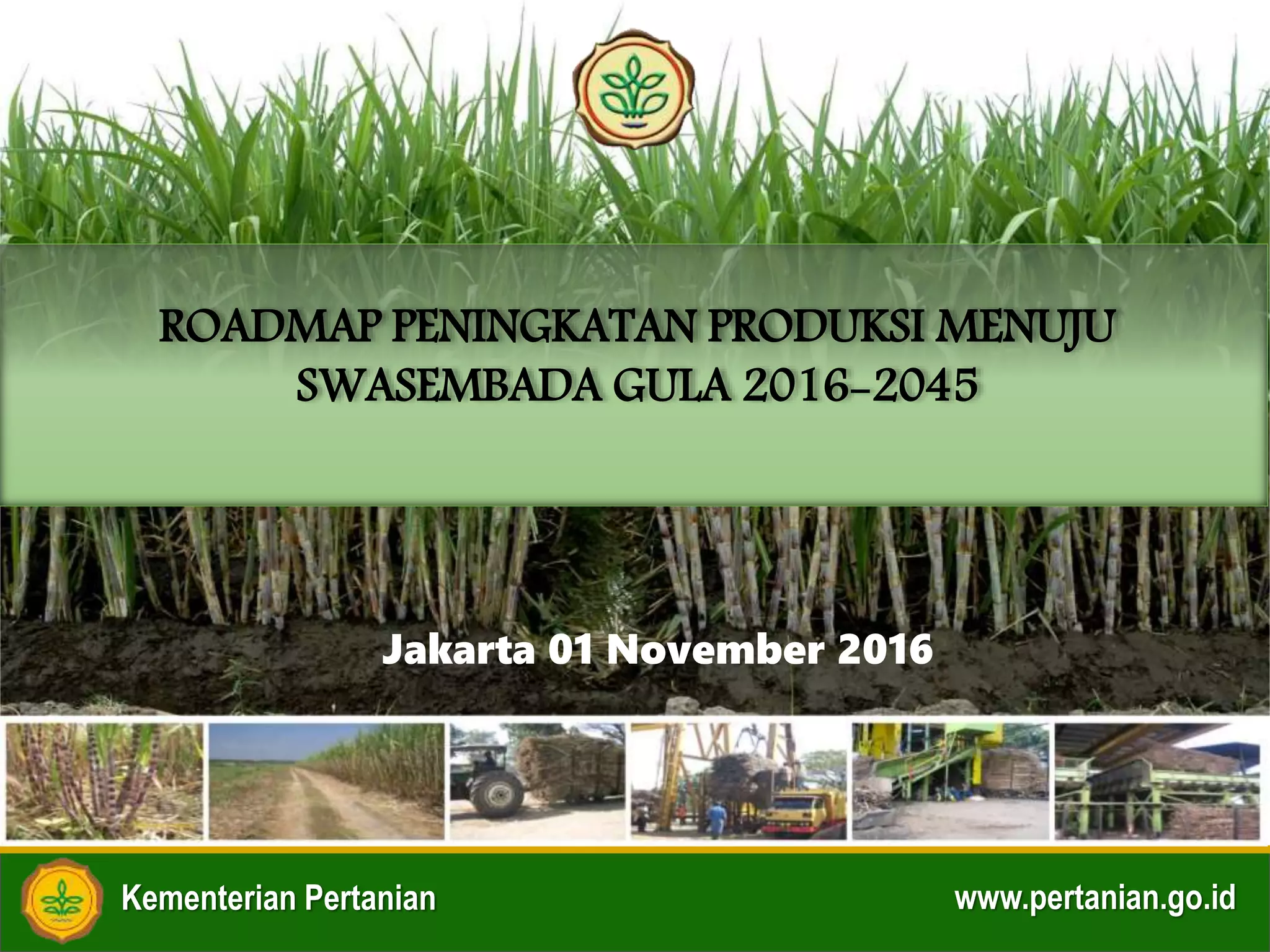 Dokumen ini membahas roadmap peningkatan produksi gula di Indonesia menuju swasembada dari 2016 hingga 2045, mencakup permasalahan saat ini, proyeksi produksi dan konsumsi, serta langkah-langkah yang diperlukan untuk mencapai target tersebut. Saat ini, produksi gula nasional berada pada defisit, dan untuk mencapai produksi yang mencukupi 90% kebutuhan, perluasan areal, peningkatan efisiensi pabrik, dan pengadaan lahan yang sesuai menjadi fokus utama. Kebijakan dan investasi yang terencana serta dukungan semua pihak terkait dianggap penting untuk mencapai tujuan swasembada dan diversifikasi produk gula.