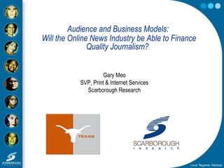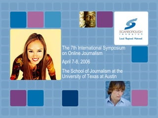 The document summarizes Gary Meo's presentation at the 7th International Symposium on Online Journalism at the University of Texas at Austin on April 7-8, 2006. The presentation discussed newspaper readership trends declining slowly but steadily over time, the large and growing audiences of newspaper websites, how print and online audiences can be complementary, and how online advertising revenue was growing but still comprised a small percentage of total newspaper revenue. It also listed challenges facing the newspaper industry like job cuts and doubts about the ability of online revenue to replace losses from print.
