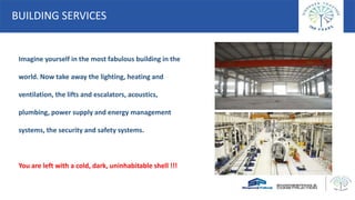 The document covers building services, focusing on the essential mechanical, electrical, and plumbing (MEP) systems that create a safe and comfortable living and working environment in buildings. It details various components such as HVAC, fire protection, electrical systems, and plumbing, while discussing the importance of coordination and integration between these systems during installation. Additionally, it highlights challenges faced in MEP integration and the necessity of proper sequencing and coordination to ensure efficient operation and maintenance of building services.