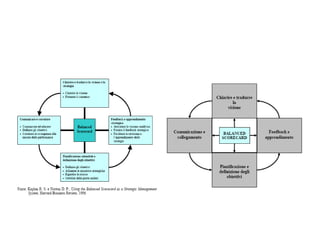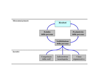 Il documento discute la gestione delle performance aziendali, evidenziando il ciclo di comunicazione interno e l'importanza di definire obiettivi chiari tramite il metodo MBO (Management by Objectives) e l'uso della Balanced Scorecard (BSC) per la misurazione delle performance. Viene analizzata l'importanza dei sistemi ERP (Enterprise Resource Planning) per supportare i processi aziendali e favorire una gestione integrata delle risorse, nonché la complessità della gestione sanitaria e le misure di soddisfazione e fedeltà del personale come indicatori chiave per la produttività. Infine, il documento sottolinea che la soddisfazione del personale e le politiche di sviluppo devono essere fondamentali per il successo dell'organizzazione.