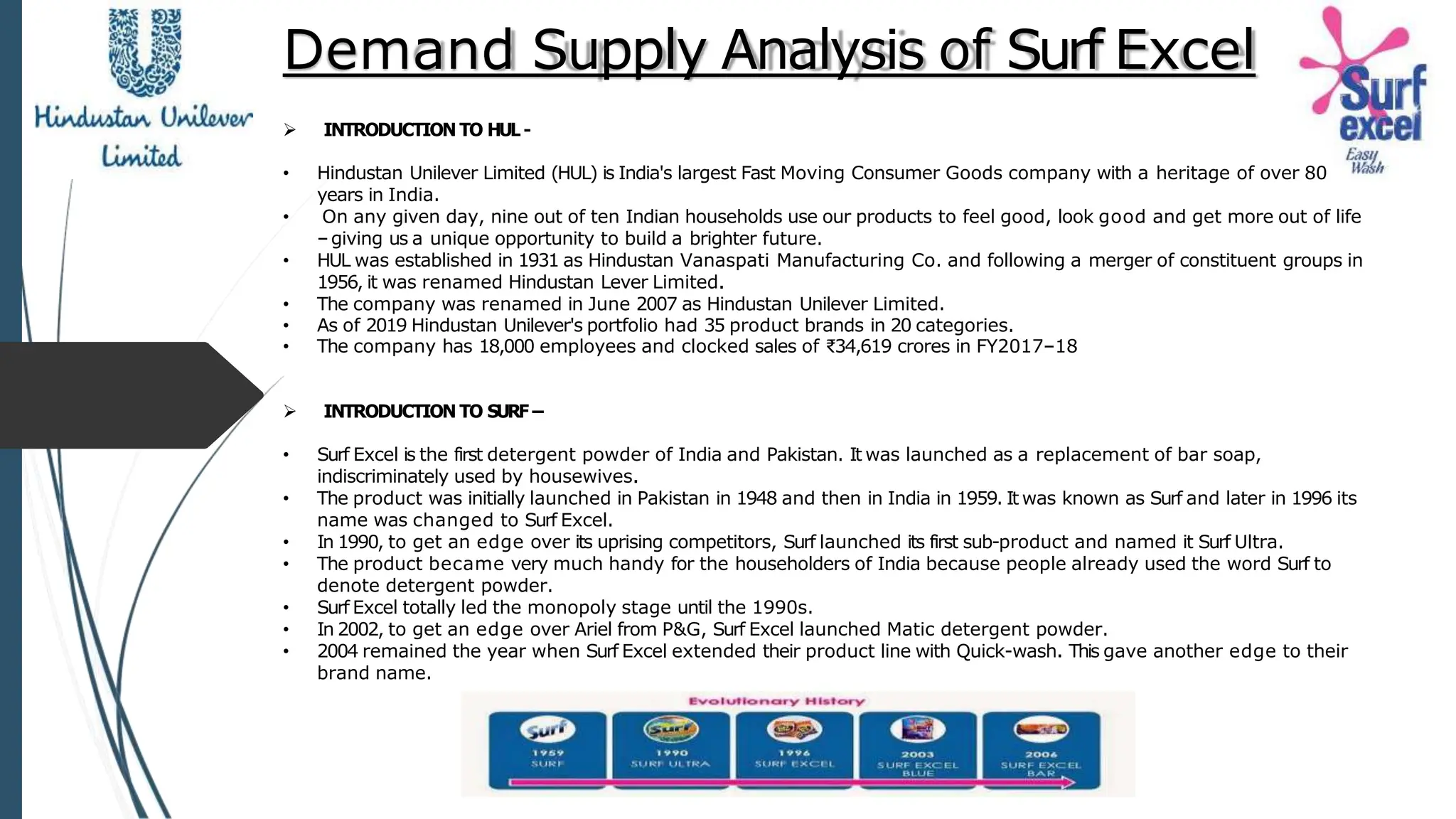 Hindustan Unilever Limited (HUL) is India's largest fast-moving consumer goods company with over 80 years in India. Surf Excel is HUL's top detergent brand, generating over Rs. 5,000 crore in annual sales. An analysis of Surf Excel's demand and supply from 2002-2004 shows that as the price decreased, demand increased in accordance with the law of demand. Similarly, as price increased from 100-400, supply also increased from 10-40 units according to the law of supply. Over the past 5 years, HUL's sales and profits have grown significantly, though future projections may be lower due to the COVID-19 pandemic's impact on business.