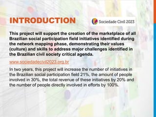 This project aims to strengthen the social participation ecosystem in Brazil by creating a digital marketplace to connect social initiatives, demonstrating their values and skills. Over two years, the project expects to increase the number of initiatives by 21%, people involved by 30%, total revenue of initiatives by 20%, and people directly involved in efforts by 100%. It will map existing networks, select initiatives for incubation, develop guidelines for replication, and launch a digital platform to connect social participation organizations across Brazil.