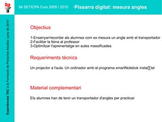 Experiències TAC a la Formació de Persones Adultes | juny de 2010 Requeriments tècnics Un projector a l'aula. Un ordinador amb el programa smartNotebok instal·lat 5è SETICPA Curs 2009 / 2010 Objectius 1-Ensenyar/recordar als alumnes com es mesura un angle amb el transportador 2-Facilitar la feina al professor 3-Optimitzar l'aprenentatge en aules massificades Material complementari Els alumnes han de tenir un transportador d'angles per practicar ·Pissarra digital: mesura angles