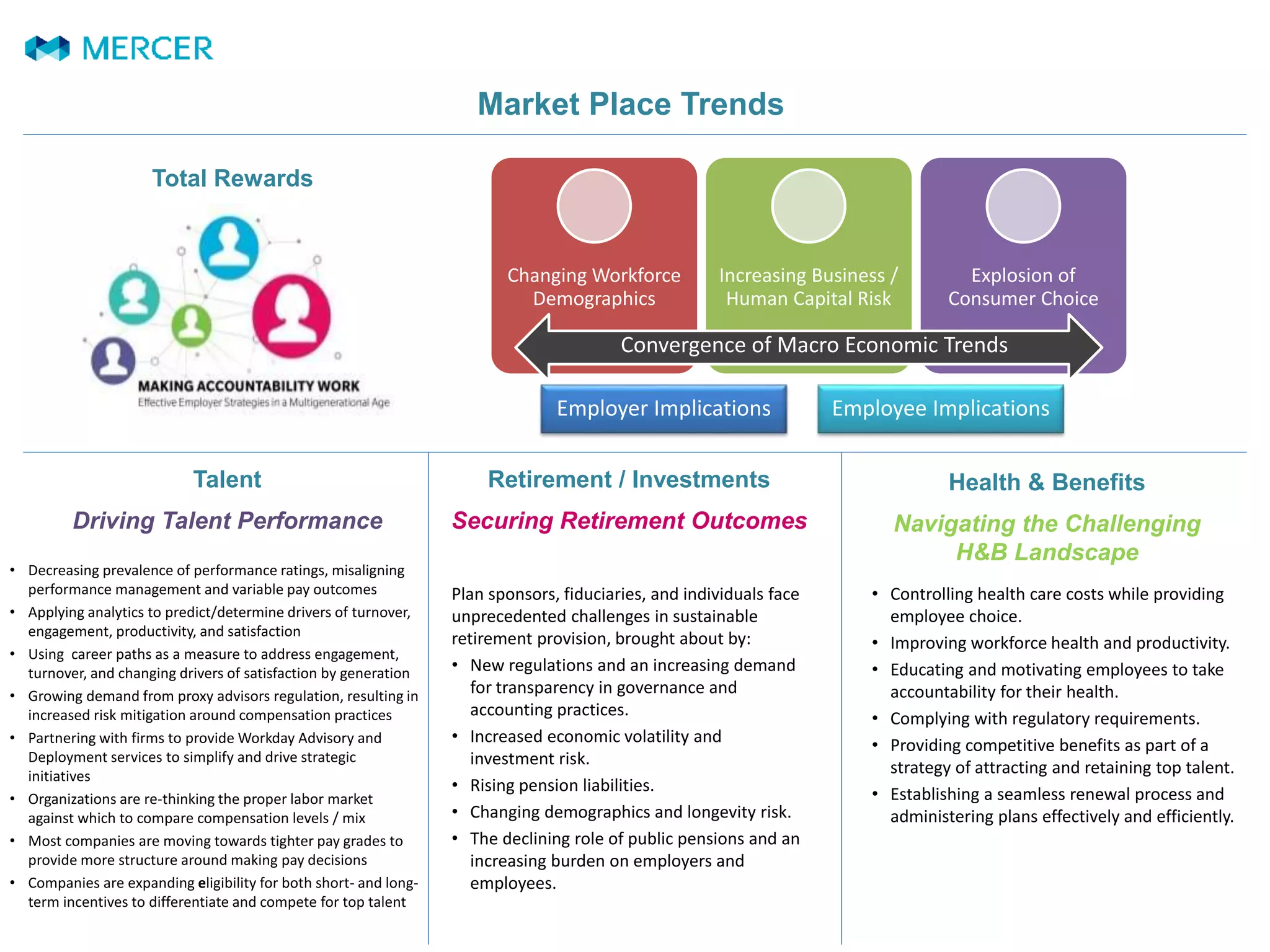 - Retirement benefits face challenges around regulations, volatility, liabilities, and changing demographics. Employers bear more responsibility.