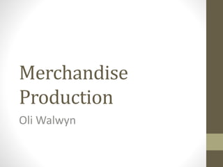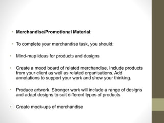 The document provides guidance on creating merchandise and promotional material for a client. It instructs to mind map product and design ideas, create a mood board with examples from the client and related organizations, and produce a range of design artwork that can be adapted to different product types. Mockups of potential merchandise should also be created. Examples shown include applying a logo design to t-shirts, mugs, a travel mug, and wallet through an online service.