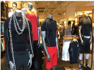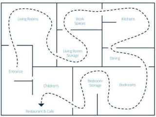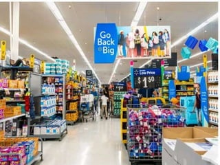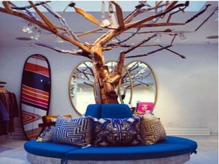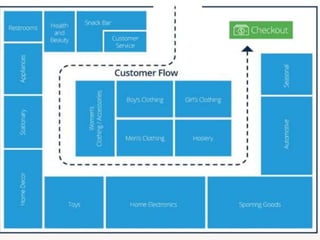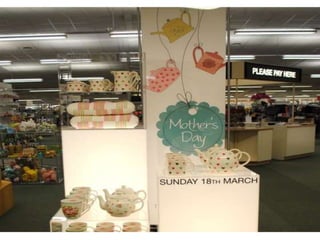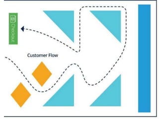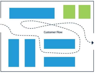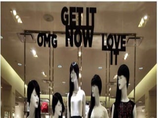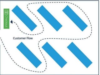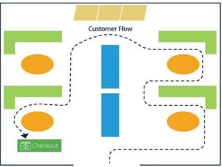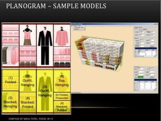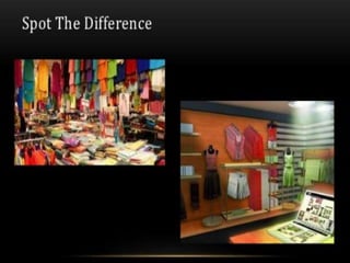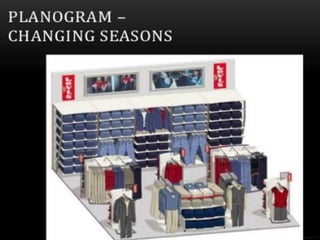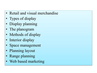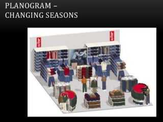 This document discusses various techniques for visual merchandising in retail stores. It begins by defining visual merchandising and outlining its benefits such as reflecting the brand, engaging customers, and increasing sales. It then covers specific techniques like using mannequins effectively, keeping seasonal items prominently displayed, and utilizing the point of sale area. The document also discusses types of merchandising displays including slat walls, grid walls, pegboards, and table displays. Finally, it outlines steps for effective display planning like identifying customer flow patterns and designing for clockwork navigation around the store.