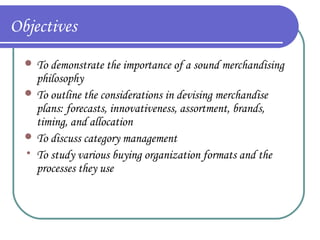 This document provides an overview of retail merchandising concepts. It outlines the objectives of understanding merchandising philosophy, merchandise plans, category management, and buying organization formats. It then defines key merchandising terms and discusses the role and responsibilities of merchandisers, including planning, directing, coordinating, and controlling merchandising activities. The document also summarizes concepts related to merchandise management, accounting, and financial analysis, including sales forecasting, determining merchandise requirements, income statements, and calculating gross margin return on investment.