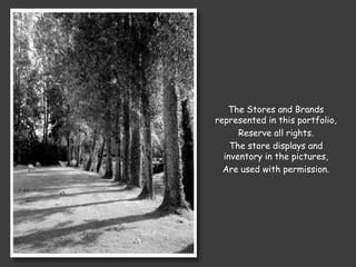 This portfolio document contains images and descriptions of store displays and merchandising created by Andrew Squires. The document provides tips on using clusters, layers, and accessories to showcase styles and sell products. It also emphasizes the importance of signage, highlighting new items, and creating eye-catching window displays like a six-foot snowflake to attract customers. The portfolio aims to showcase Squires' skills in visual merchandising and store design.