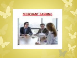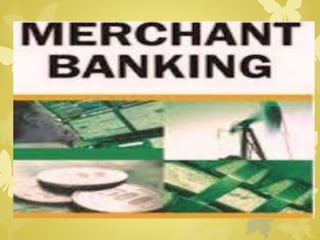 The document discusses the history and evolution of merchant banking in India. It provides details about modern merchant banking services, categories of merchant bankers based on net worth, and differences between merchant banks and commercial banks. Key points covered include that merchant banking originated in Italy and France in the 17th-18th centuries and was introduced to India through Grindlays Bank in 1967. Modern merchant banks provide services like management advising, underwriting, and portfolio management.