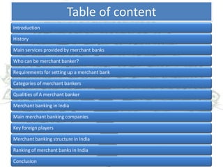 Merchant banking provides various financial services to corporations including corporate counseling, project counseling, loan syndication, managing securities offerings, and portfolio management. To become a merchant banker in India, an entity must register with the Securities and Exchange Board of India and meet certain net worth requirements that vary based on the category of registration. Some of the major merchant banking companies in India include ICICI Securities, SBI Capital Markets, Axis Bank, and Kotak Mahindra Capital Company. Merchant banking first began in India in 1967 and has grown to include both public and private sector banks and financial institutions that help companies raise capital and advise on mergers and acquisitions.