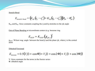 This document discusses molecular mechanics force fields, specifically the Merck Molecular Force Field (MMFF). It provides details on the functional form and parameters of MMFF, including that it is a Class II force field designed to accurately model conformational energies and non-bonded interactions of pharmaceutical compounds. The total energy expression for MMFF is provided, including terms for internal interactions like bonds, angles, and torsions, as well as nonbonded van der Waals and electrostatic terms. Application of MMFF in the CHARMM program is also described.