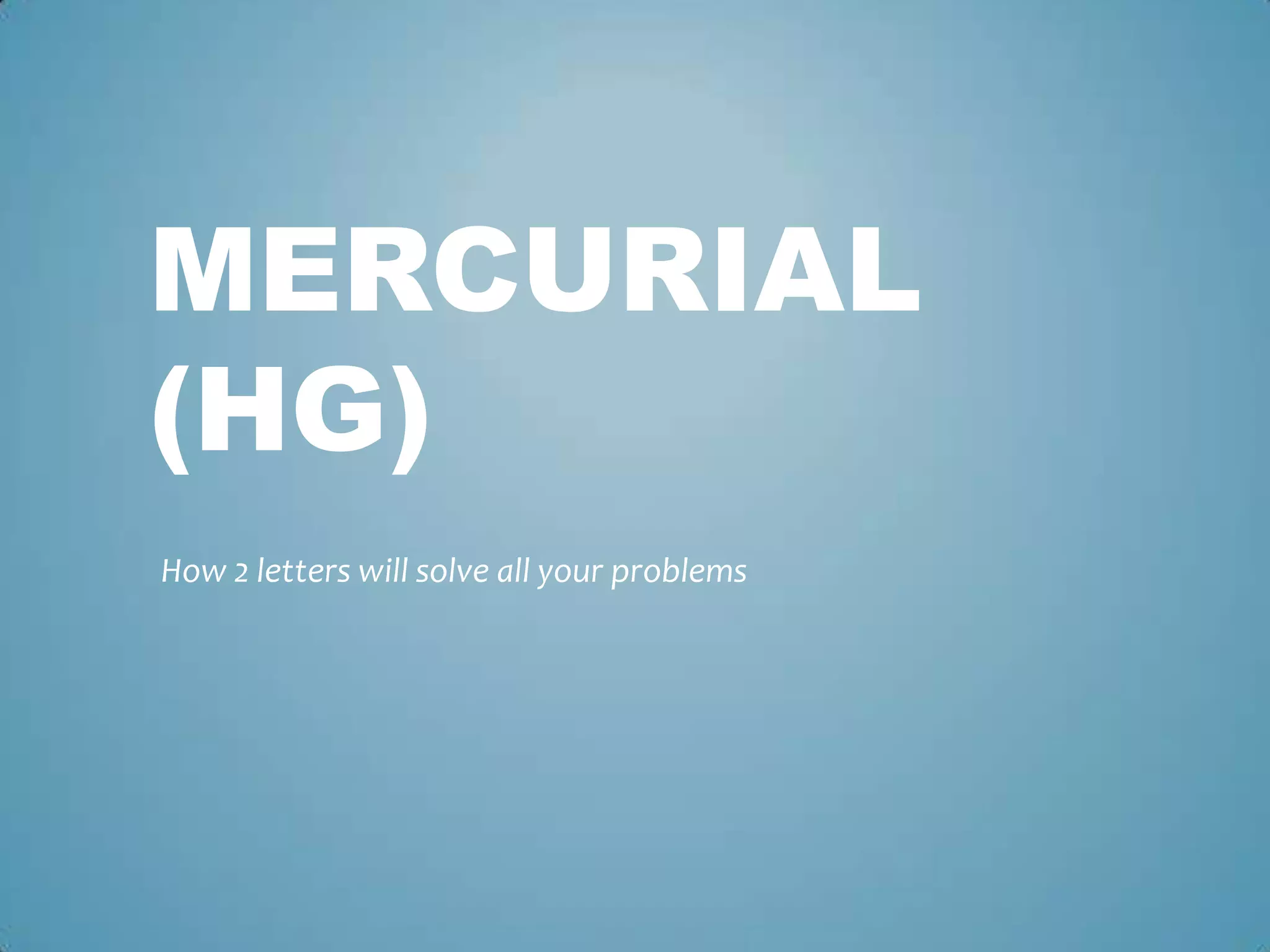 Mercurial (hg) is a version control system that allows developers to work collaboratively without conflicts through features like branching, merging, pulling and pushing changes. It solves coordination problems between developers by allowing them to independently work on code and easily integrate their changes. Hg enables workflows where all developers have equal access to commit to a shared repository, or where one "codebase overlord" controls pushes to the main codebase.