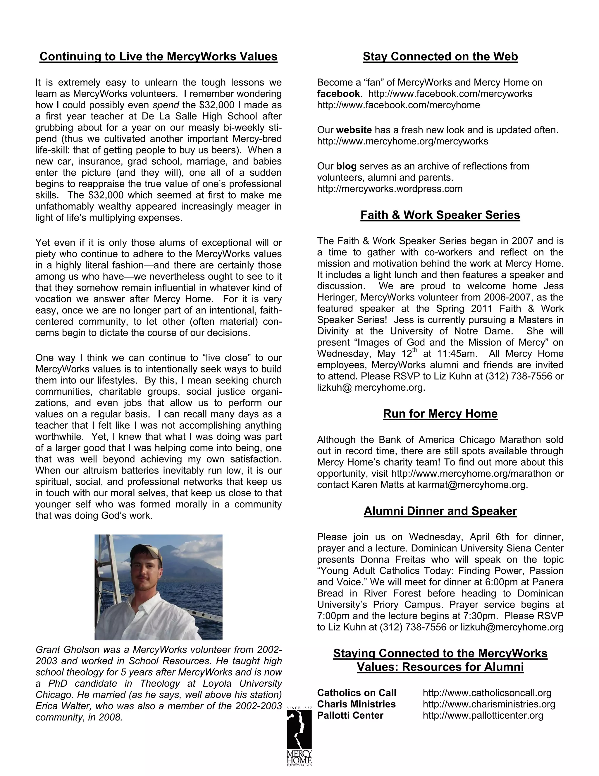 The volunteers at Mercy Home have been keeping busy with various activities during the winter months such as a retreat, classes, and celebrating holidays. They are now looking forward to spring and have many upcoming events planned like a shamrocks fundraiser, quarterly liturgy & brunch, and an alumni dinner & speaker. The volunteers are also getting involved in their community through activities like tutoring, sports teams, church groups, and nonprofit organizations.