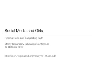 This document summarizes a presentation on supporting girls' faith through social media. It discusses research on adolescent brain development and girls' brains in particular. It outlines three frameworks from literature: what brain research tells us, the "sacred selves of adolescent girls", and "pedagogies of recognition". The presentation provides an analogy comparing healthy media practices to a healthy diet. It offers examples of tools and practices for engaging different age groups with media in a way that fosters realization, resilience, resistance and ritual. The overall message is that digital media can support girls' faith development when approached as a communicative practice within community.