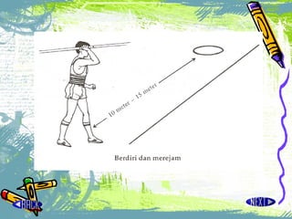 Dokumen tersebut memberikan panduan mengenai asas-asas merejam lembing, termasuk teknik memegang dan merejam lembing, latihan asas, keselamatan, peraturan pertandingan, dan spesifikasi lembing. Dokumen tersebut memberikan informasi mengenai langkah-langkah dasar untuk mempelajari sukan merejam lembing.