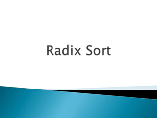 The document describes sorting algorithms, specifically merge sort and radix sort, detailing their methods of operation and implementation. Merge sort, invented by John von Neumann, utilizes a divide-and-conquer approach to recursively sort data by merging sublists, while radix sort categorizes integers based on their digits and processes them in order. It includes C++ code examples for both algorithms illustrating their execution and sorting capabilities.