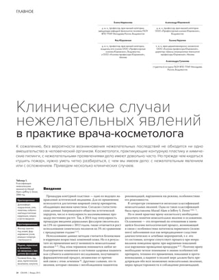 Документ содержит информацию о нежелательных явлениях и осложнениях, связанных с процедурами косметологии, такими как контурная пластика и химические пилинги. Описаны клинические случаи пациентов с различными проявлениями после процедур, включая отечность, болезненность и аллергические реакции, а также предложены методы лечения. Подчеркивается важность различения нежелательных явлений от осложнений и необходимости информирования пациентов о возможных рисках.