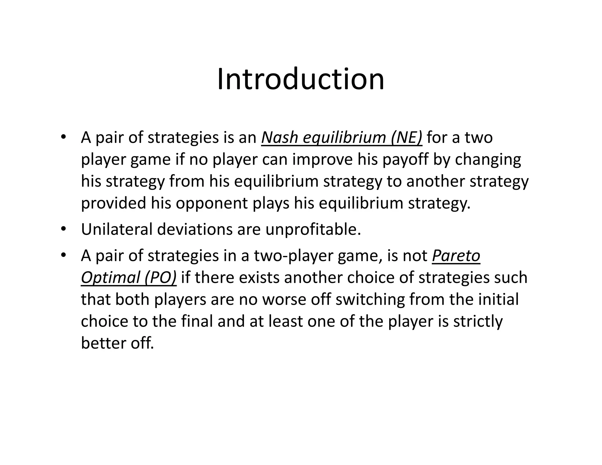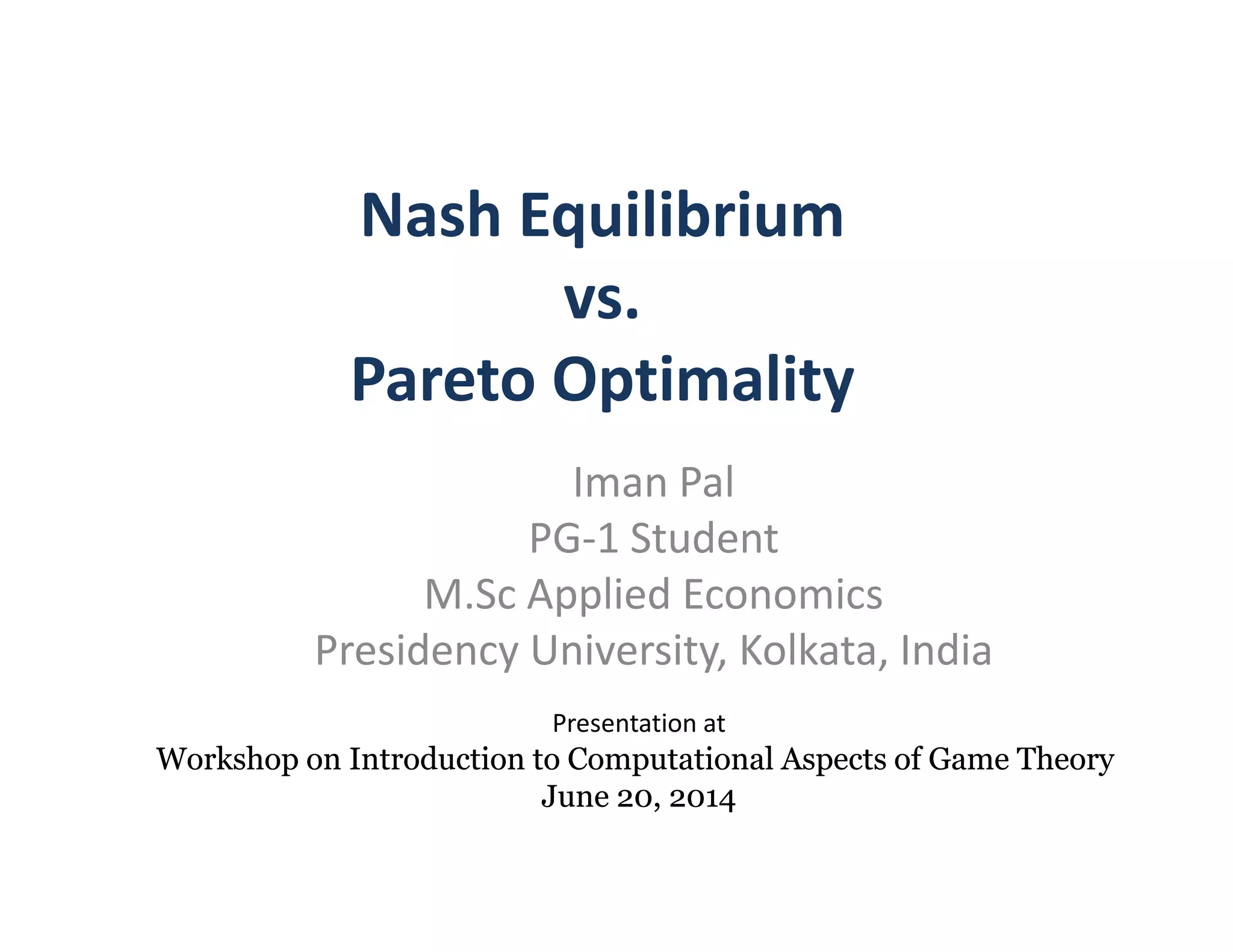 Nash equilibrium and Pareto optimality are discussed and compared using examples from game theory. In the Battle of Sexes game, the Nash equilibria coincide with the Pareto efficient outcomes. However, in other games like the Prisoner's Dilemma and the Tragedy of the Commons, the Nash equilibria are not Pareto optimal and there is a possibility of Pareto improvement by playing different strategies. Braess's Paradox is also discussed where adding more resources to a network can paradoxically decrease overall performance at equilibrium due to drivers taking suboptimal routes.
