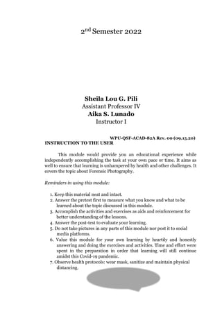 This module discusses crime scene photography and preparing court exhibits. It provides an overview of the importance and objectives of photography at crime scenes, which is to document the scene and evidence before anything is moved or altered. Key matters to consider when taking crime scene photos include getting shots at eye level, taking a minimum of 4 photos to document an area, and getting general, medium, and close-up shots to show important details. Proper preparation of court exhibits through accurate crime scene photos can help refresh memories and preserve details to assist investigations and court cases.