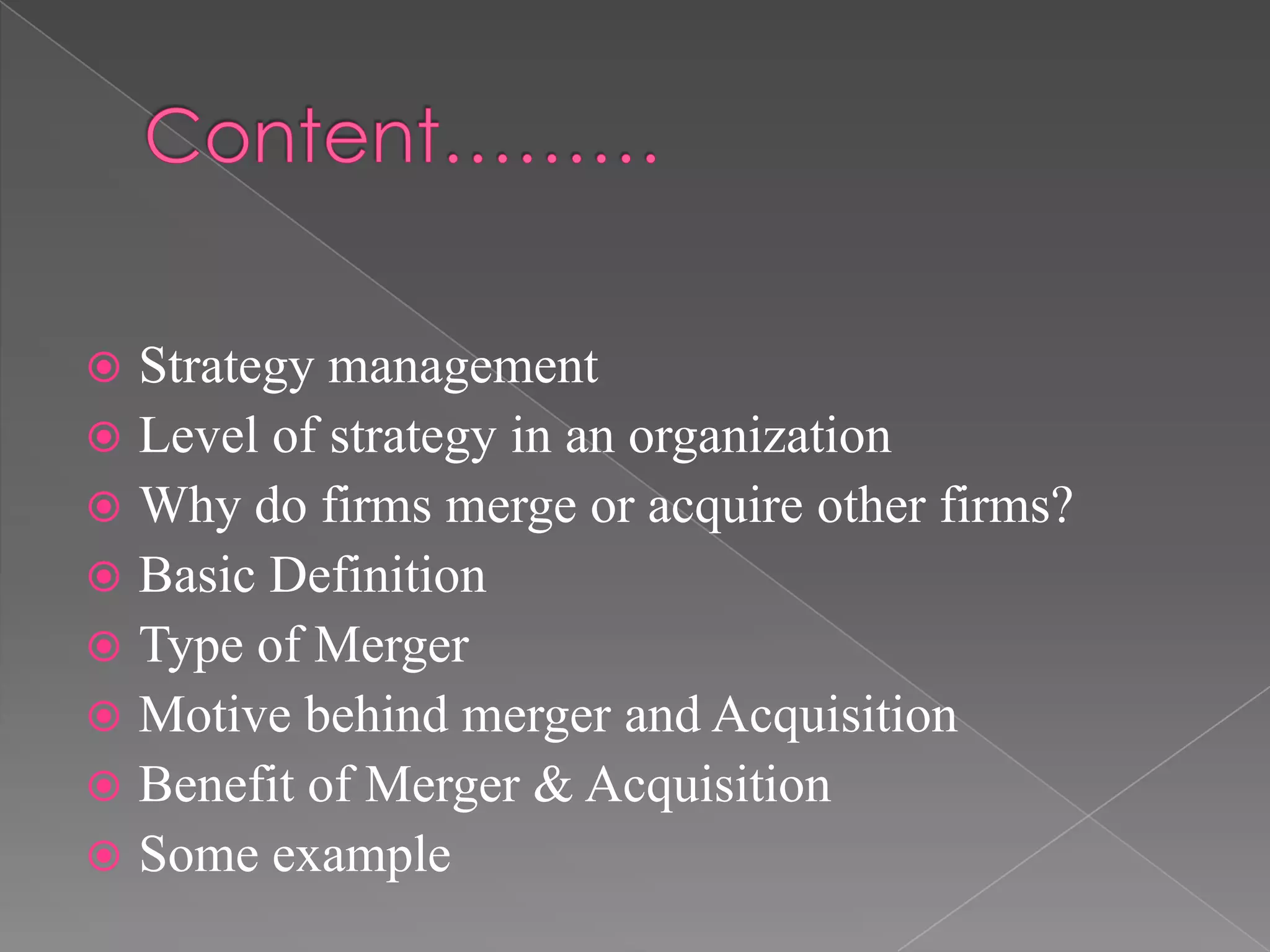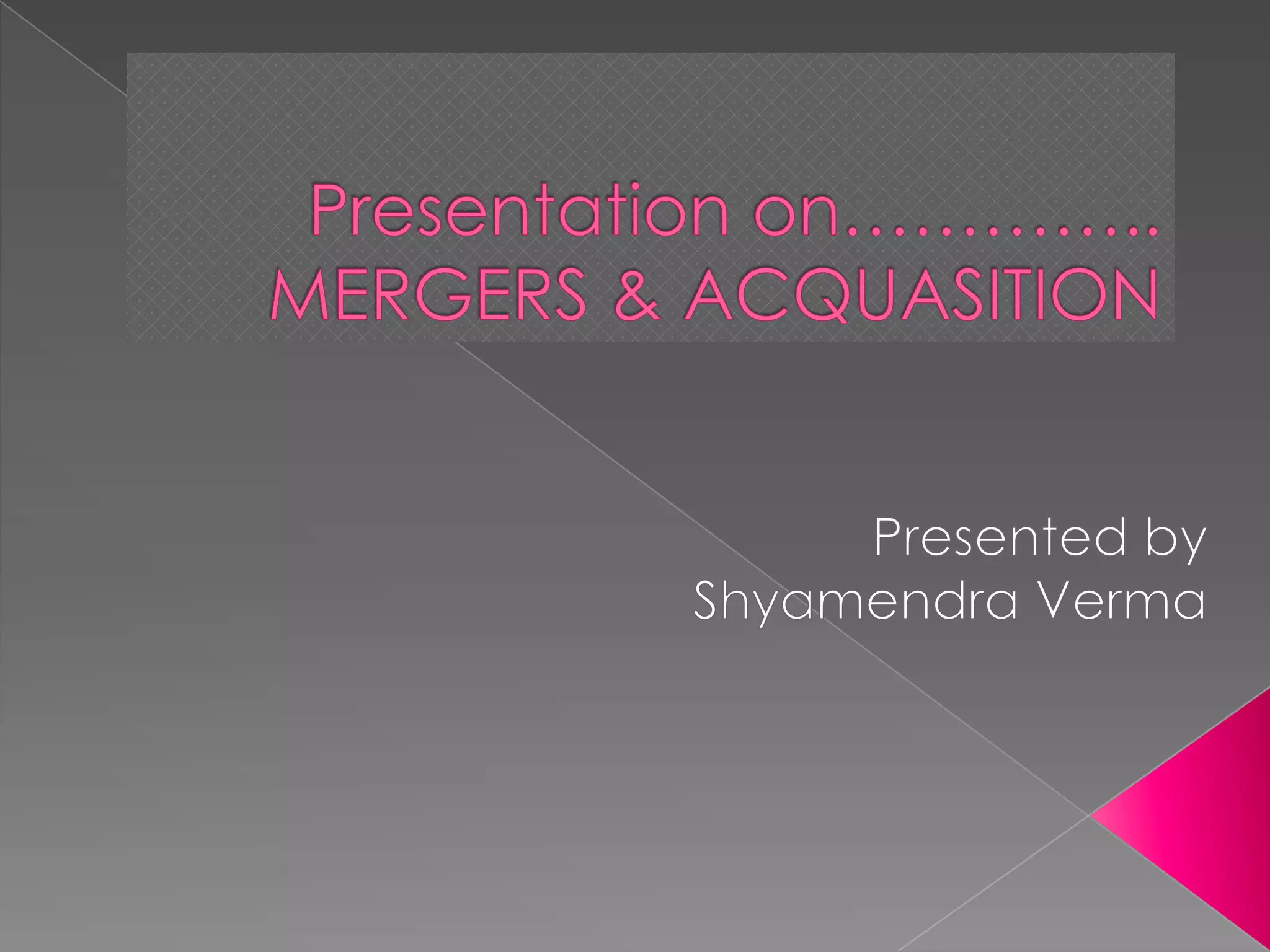 This document discusses mergers and acquisitions from several perspectives. It defines mergers and acquisitions, describes the different types of mergers including horizontal, vertical, conglomerate and concentric mergers. It provides examples of mergers in different industries. It also discusses the common motives behind mergers and acquisitions such as increasing market power, acquiring new technologies, and improving efficiencies. Finally, it outlines some of the benefits that can result from mergers and acquisitions like faster growth, new markets, cost reductions and improved profitability.