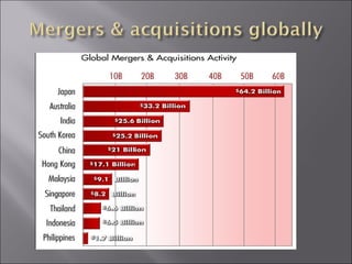 This presentation discusses mergers and acquisitions. There are several types of mergers, including horizontal mergers between companies in the same industry, vertical mergers between suppliers and customers, and conglomerate mergers between unrelated businesses. Mergers can occur through absorption, where one company acquires another, or through consolidation, where both companies dissolve to form a new entity. Acquisitions occur when one company takes control of another. Motives for mergers and acquisitions include growth, market power, diversification, economies of scale, and access to new resources or markets. The process of analyzing a potential merger or acquisition involves planning, searching for targets, financial evaluation, determining the acquisition method, negotiation, and post-merger integration.