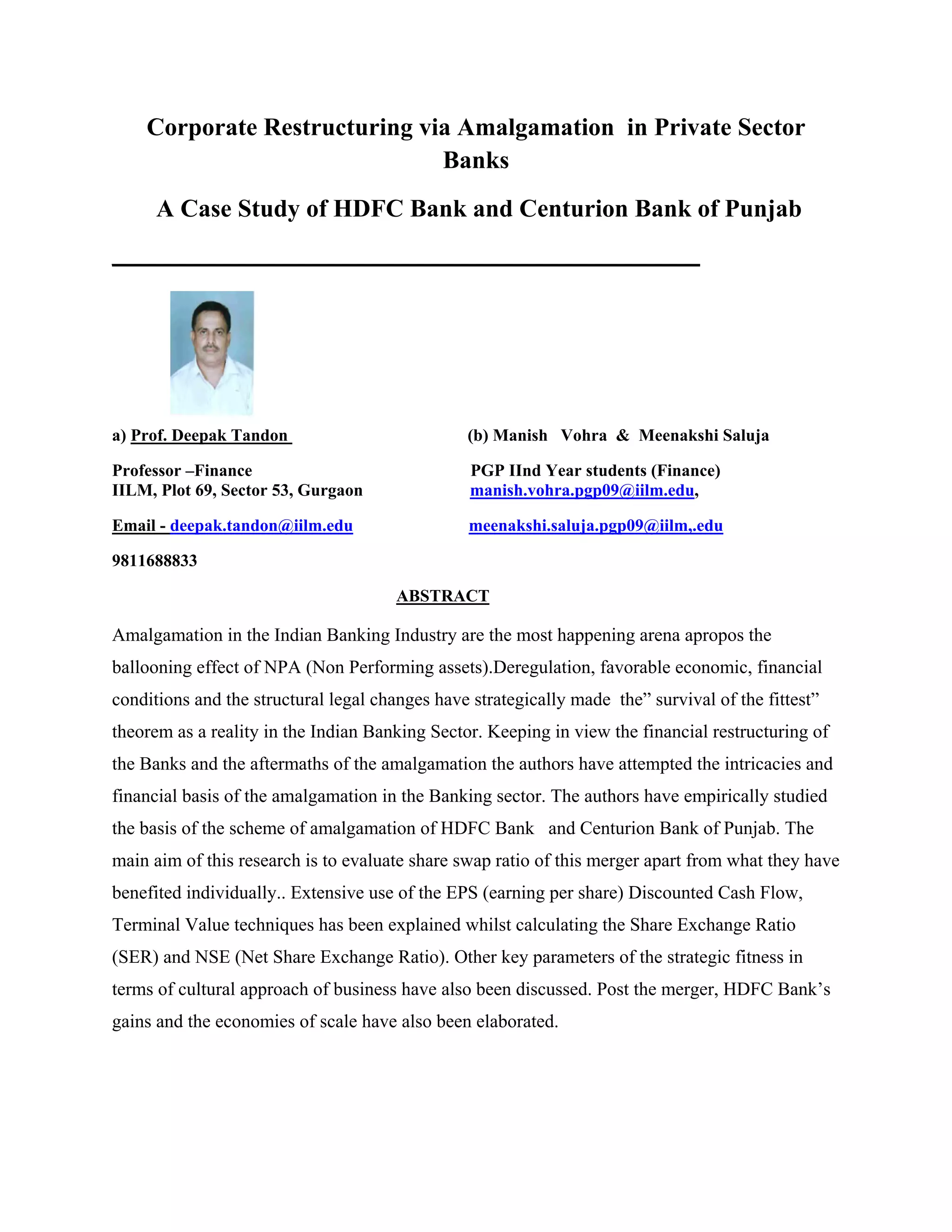 This document summarizes a case study on the corporate restructuring that occurred through the amalgamation of HDFC Bank and Centurion Bank of Punjab in India. The study aims to evaluate the share swap ratio of the merger and analyze the individual and combined benefits. It uses techniques like EPS, DCF, terminal value and WACC to calculate the share exchange ratio and net share exchange ratio. The introduction provides context on corporate restructuring and mergers & acquisitions in the Indian banking sector. The methodology section outlines a case study approach focusing on the SWOT analysis, profiles and synergies of the two banks before and after the amalgamation.
