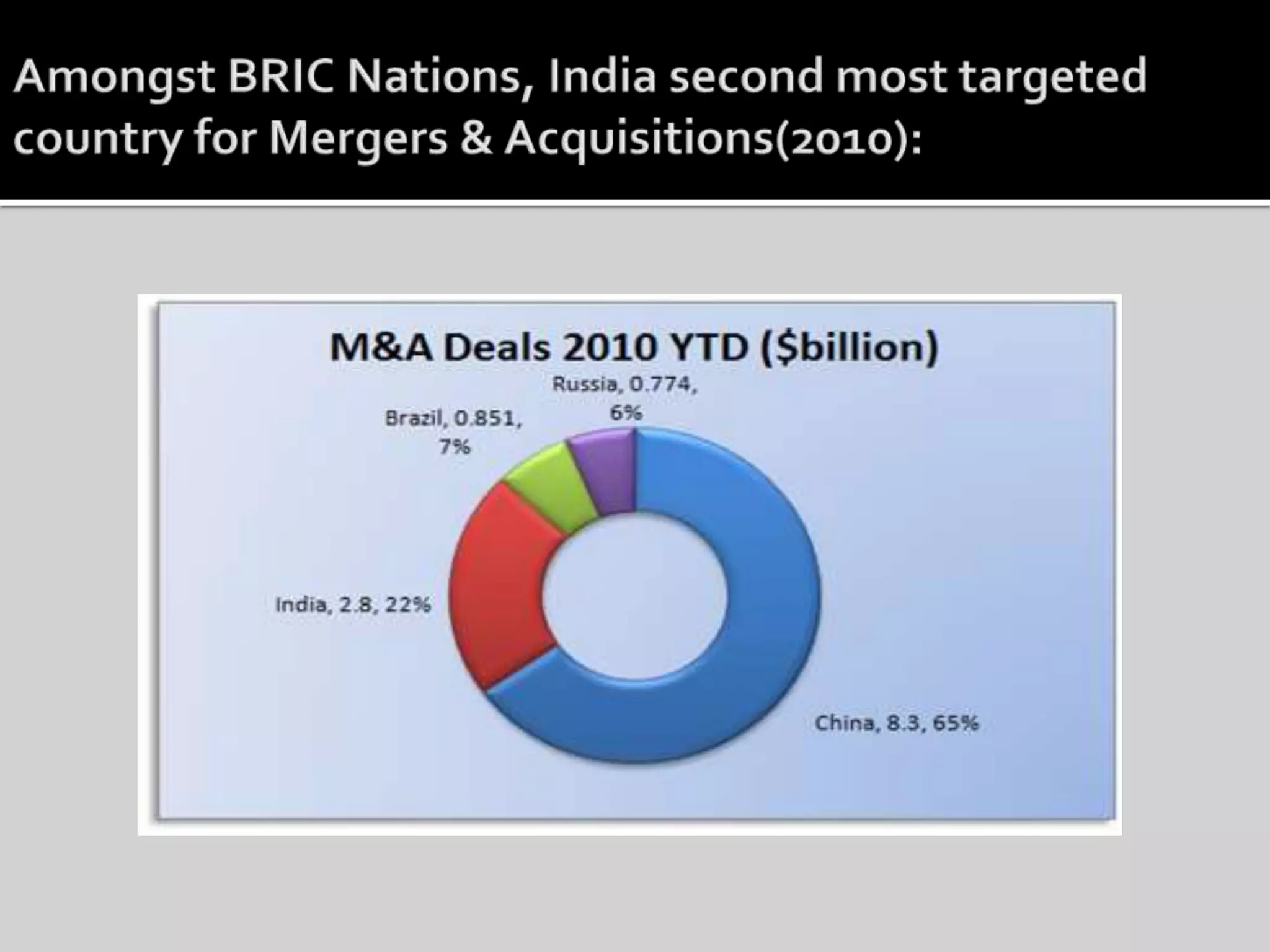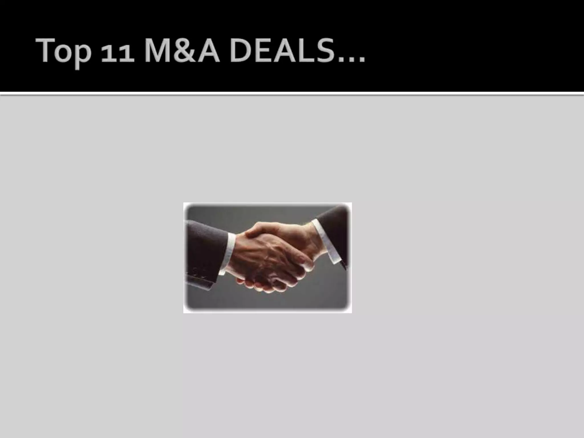 The document discusses mergers and acquisitions, providing definitions and examples. It describes the typical stages in an M&A deal including preliminary assessment, proposal, exit planning, and integration. Key factors driving M&A activity in India are also summarized such as increasing competition and globalization.