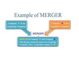 This document defines mergers and amalgamations under Indian company law. It explains that a merger involves one company absorbing another, while amalgamation creates a new company from two or more existing companies. It outlines the process for calling meetings of creditors/members to approve schemes, requirements for notice and documents to be circulated. The effect and sanctions of approved schemes by the tribunal are described, including provisions for transfers of assets/shares and dissolution of companies. Penalties for non-compliance with the process are also mentioned. The section also discusses cross-border mergers between Indian and foreign companies.