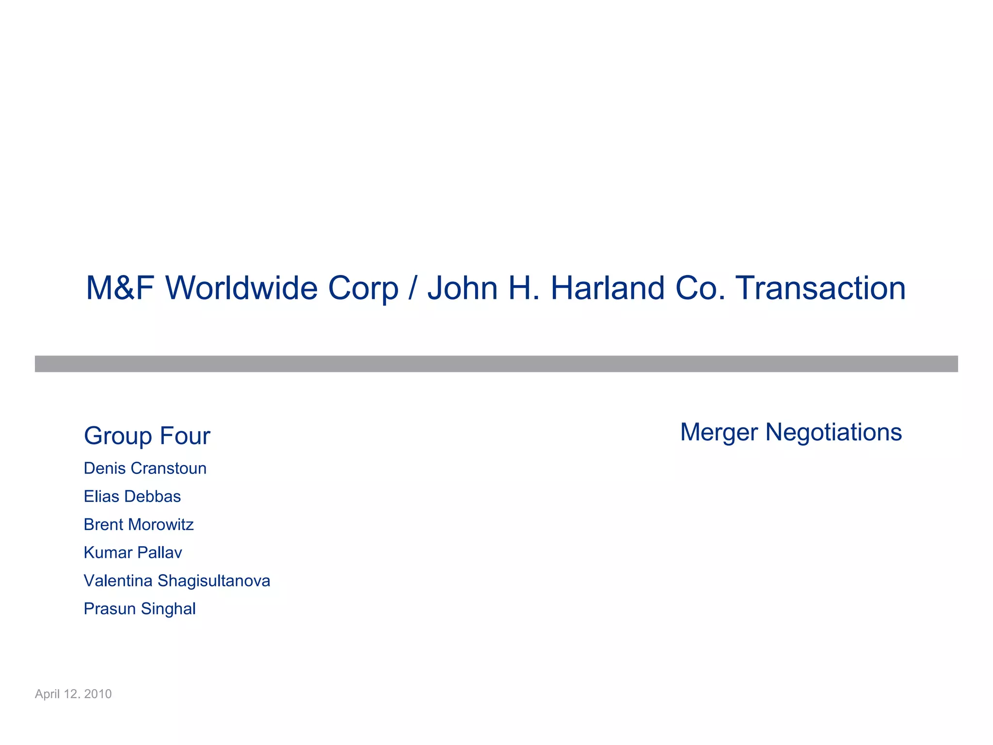The document summarizes M&F Worldwide's proposed acquisition of Harland Corporation. Some key points: