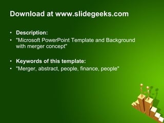 This PowerPoint template features an abstract background design related to the concept of a merger, and is intended to be used when presenting information about a merger. It includes keywords like "merger", "abstract", "people", and "finance" to help identify its purpose and content. The template can be downloaded from www.slidegeeks.com.