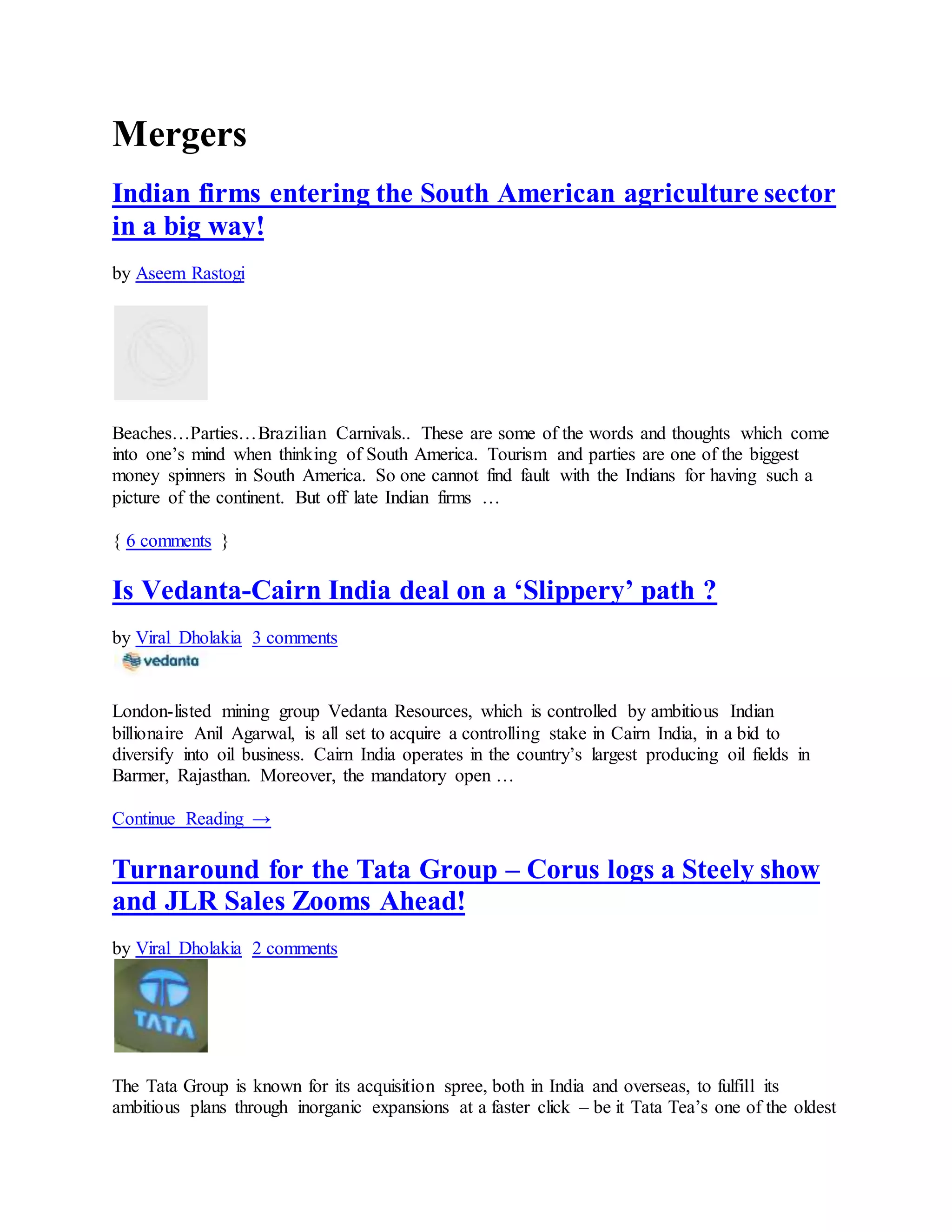 This document contains summaries of multiple articles related to mergers and acquisitions involving Indian companies. It discusses Indian firms expanding into South American agriculture, the potential Vedanta-Cairn India deal, Tata Group's acquisition of Corus Steel and performance of Jaguar Land Rover, various M&A deals in the telecom sector including Reliance Industries acquiring Infotel and Reliance Communication's potential deals, pharma companies being acquired by multinationals, private equity investment in India reaching $2 billion in the first quarter of 2010, and Bharti Airtel's acquisition of Zain's African assets.