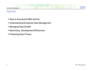 The document discusses mergers and acquisitions (M&A) with a focus on the critical role of IT integration strategies for successful outcomes. It outlines various IT approaches during M&A, emphasizes the importance of early IT involvement, and addresses the challenges of data management, including application decommissioning and data privacy. Additionally, it highlights the exponential growth of digital data and the necessity for effective data archiving and privacy protection solutions.