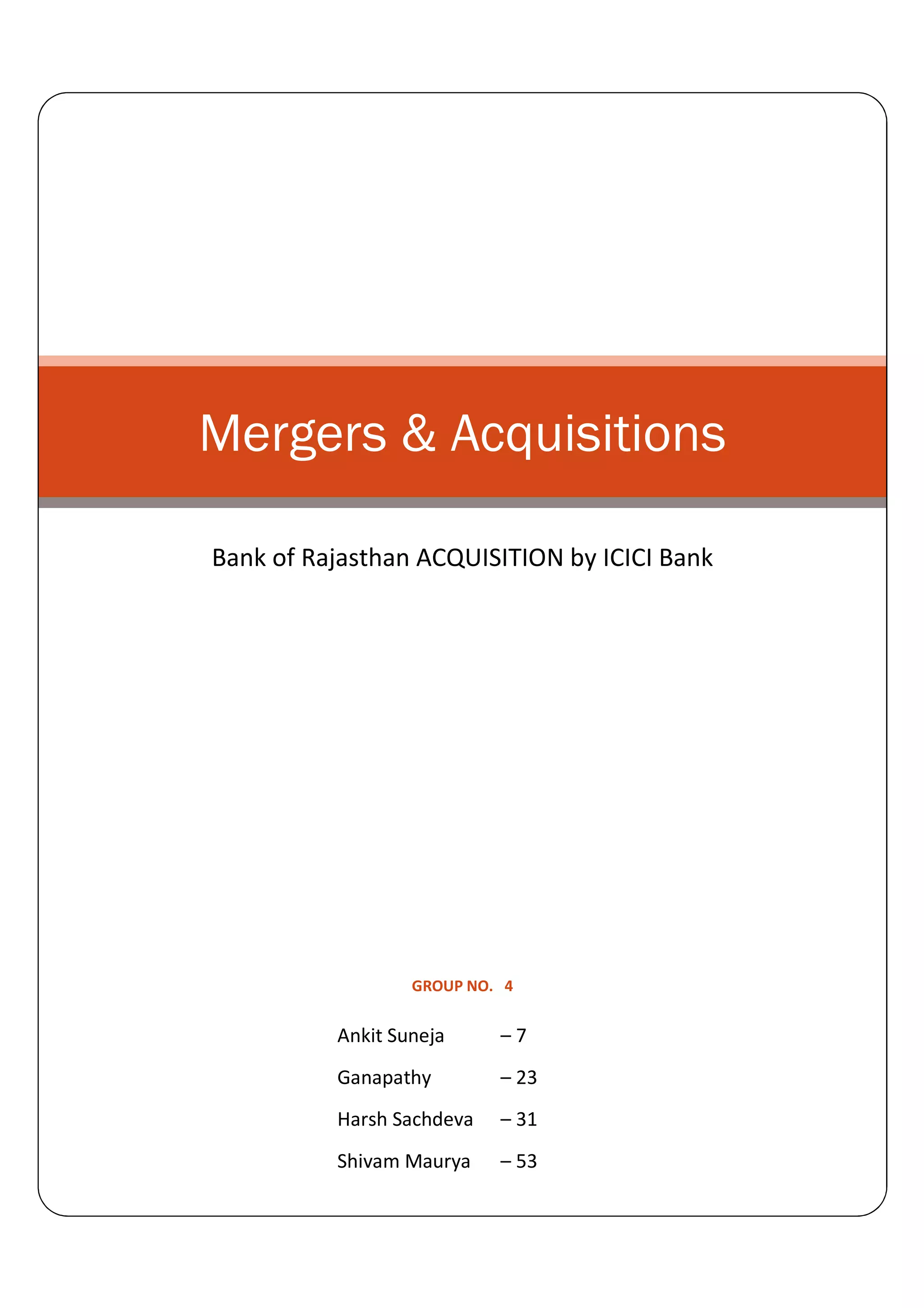 The document summarizes the acquisition of Bank of Rajasthan by ICICI Bank. ICICI Bank agreed to acquire Bank of Rajasthan to strengthen its presence in northern and western India and expand its branch network. The deal valued Bank of Rajasthan at about 2.9 times its book value. However, there were some issues such as potential risks from Bank of Rajasthan's non-performing loans and employee unions opposing the merger. The shareholders and boards of both banks ultimately approved the merger at a share swap ratio of 1:4.72.
