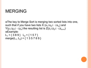 The document discusses the merge sort algorithm. Merge sort works by recursively dividing an unsorted list in half until each sublist contains one element, and then merging the sublists back together in sorted order. This can be done by dividing the list, sorting each half via recursive calls, and then using a merge process to combine the now-sorted halves into a fully sorted list. The document provides examples of merging two sorted lists and walking through the full merge sort process on a sample input list. It analyzes the time complexity of merge sort as O(n log n) and discusses in-place versus double-storage implementations.