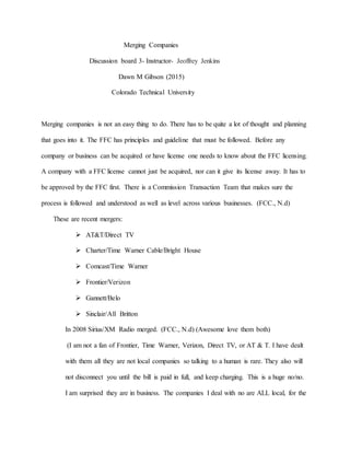 Merging companies requires significant planning and approval from regulatory bodies like the FCC. The FCC has principles and guidelines for mergers that must be followed, including filing an application and undergoing public review and comment. Recently merged companies include AT&T/DirectTV, Charter/Time Warner Cable/Bright House, Comcast/Time Warner, Frontier/Verizon, and Gannett/Belo. The merger process involves filing an application, initial public notice, review of major transactions, public comment periods, and adherence to rules around confidential information.