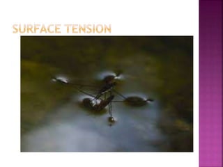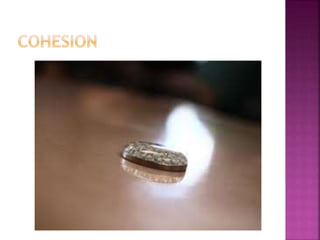 This document discusses surface tension, cohesion, adhesion and capillarity. Surface tension is the force of attraction of molecules towards the surface and sides of a liquid. Cohesion is the attraction between the same molecules, while adhesion is the attraction between different molecules. Water drops form spherical shapes to reduce surface area due to surface tension. Capillarity is the ability of liquids to flow in narrow tubes against gravity.