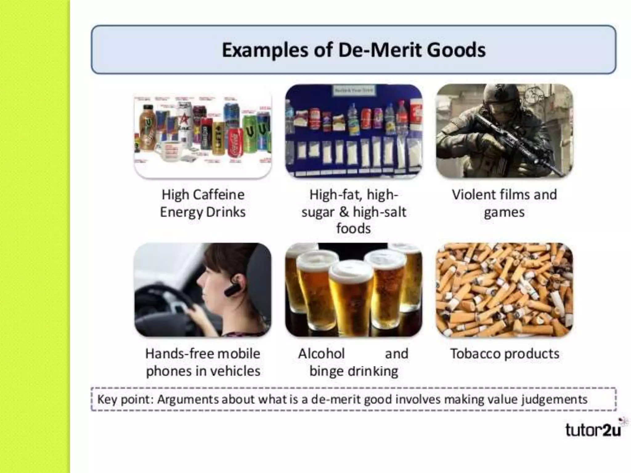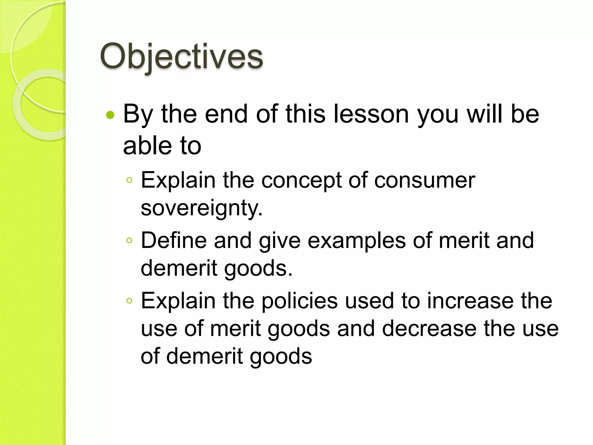 This document discusses merit and demerit goods. Merit goods provide positive externalities to society and are underprovided in free markets. The government encourages their consumption through subsidies, free provision, compulsion, and information campaigns. Demerit goods cause negative externalities and are overconsumed in free markets. The government discourages them through taxes, regulations, bans, and education programs to correct for market failures around these goods.