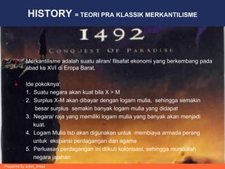 Dokumen ini membahas tentang teori merkantilisme, yang menekankan pentingnya surplus perdagangan untuk memperkuat negara melalui akumulasi logam mulia. Selain itu, dokumen menjelaskan sistem pencatatan statistik ekspor dan impor di Indonesia, serta klasifikasi barang berdasarkan berbagai kategori untuk tujuan statistik dan perdagangan. Proses pengolahan dan penyajian data statistik ekspor/impor juga diuraikan.